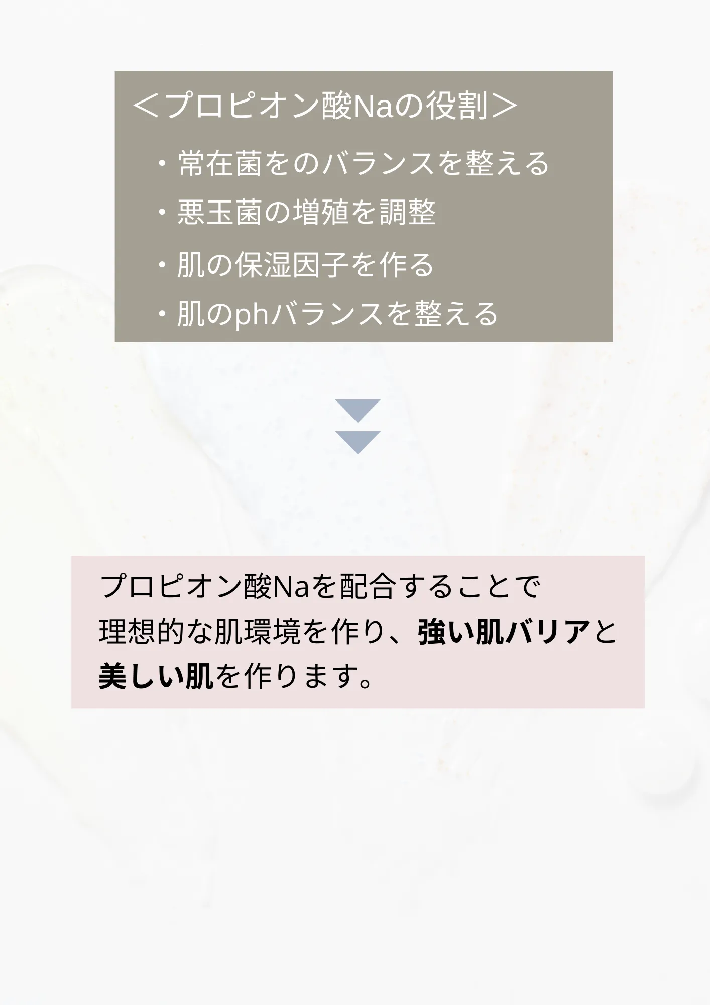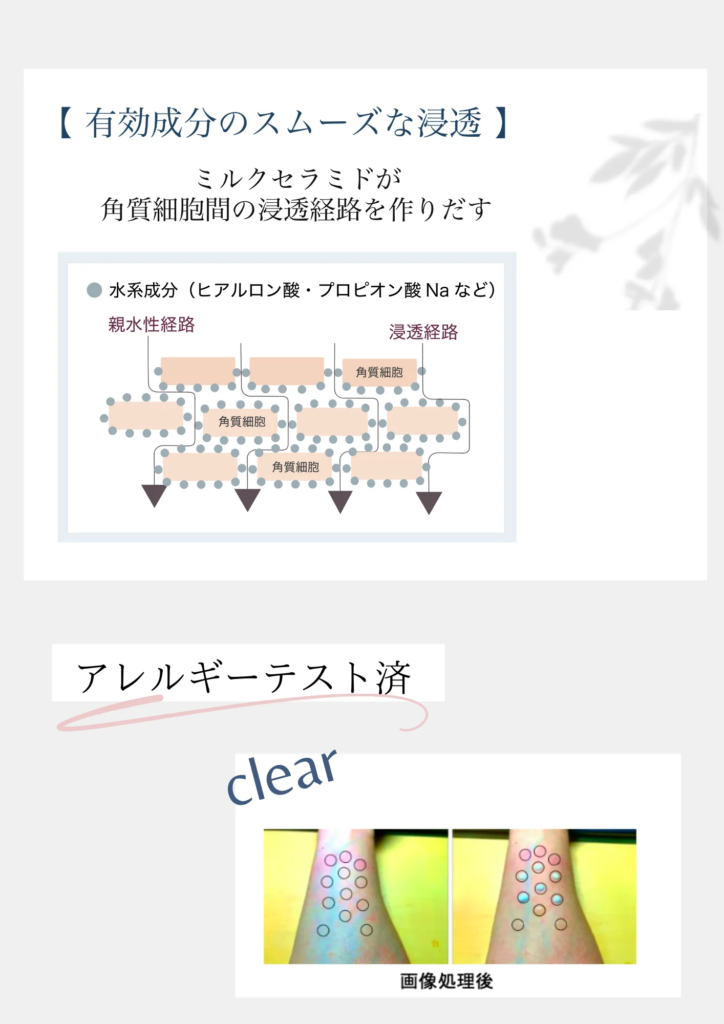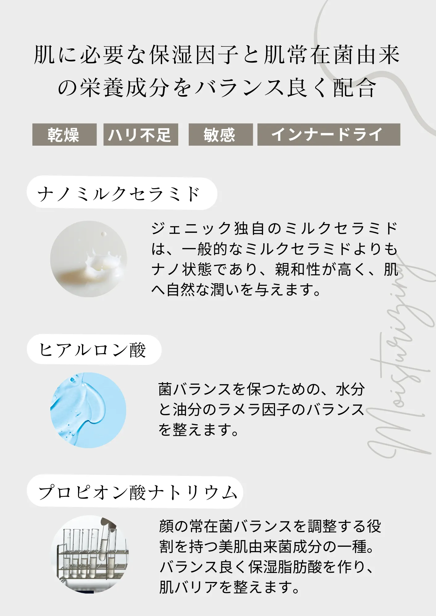 水、BG、1,2-ヘキサンジオ ール、DPG、乳エキス、乳糖、ヒアルロン酸Na、 キサンタンガム、プロピオン酸Na、スフィンゴミエリン(セラミド誘導体)